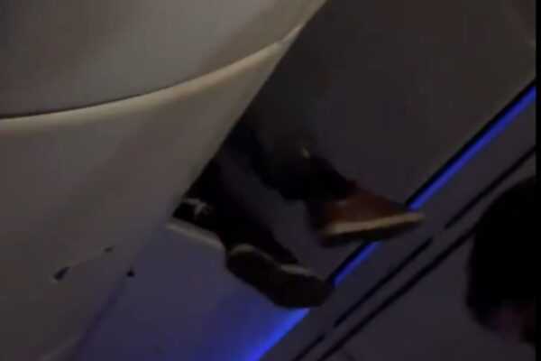 Por meio de um vídeo publicado nas redes sociais, é possível ver o momento em que o passageiro aparece preso, após ter sido lançado da cadeira durante a turbulência. Confira.