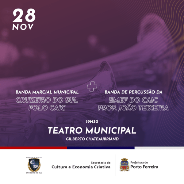 O acontecimento ocorre no Teatro Municipal Gilberto Chateaubriand, localizado na rua São Sebastião, 324, no Centro, e tem entrada gratuita. Link para retirada de ingressos: https://www.sympla.com.br/evento/concerto-de-fim-de-ano-bandas-municipais-polo-caic/2745920