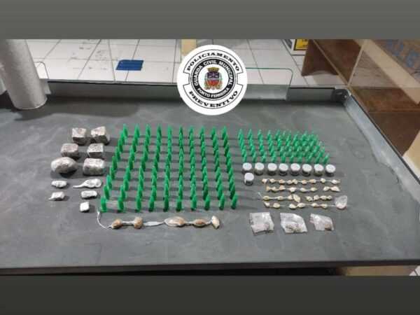 Quando a viatura se aproximou do local conhecido como “biqueira do barranco” um homem fugiu, não sendo provável abordá-lo, no entanto, ele arremessou uma sacola durante a fuga que foi localizada pelos guardas civis municipais, tendo em seu interior; 140 eppendorf’s de cocaína; 32 pedras e crack; 29 invólucros de maconha; 5 invólucros de haxixe e 03 invólucros de Skank