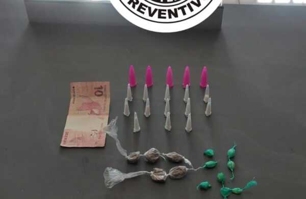 Então os policiais se deslocaram até o local onde abordaram a mulher que trazia consigo uma pochete contendo: 18 eppendorf’s de cocaína; 07 pedras de crack; 05 invólucros de maconha R$ 48,00.