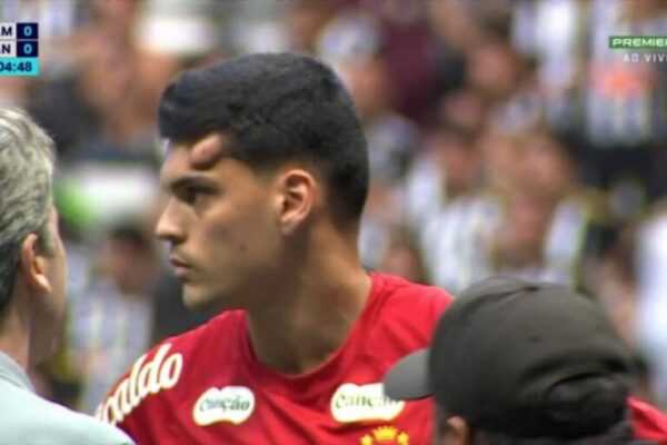 Leia também Esportes Gabriel Brazão tranquiliza depois de pancada na cabeça: “Só um susto” Esportes Brazão, do Santos, deixa campo de maca depois de joelhada na cabeça Esportes Gabriel Brazão, do Santos, é o goleiro com mais defesas no mundo Esportes Atlético-MG e Santos empatam através do Brasileirão em jogo caótico O defensor do Peixe se chocou com o meio-campista Igor Gomes durante o jogo e chegou a ficar inconsciente antes de ser solicitado o atendimento. Ao se antecipar de um cruzamento dos donos da casa, o rosto do goleiro acertou em cheio o joelho do jogador do Galo. O impacto gerou um hematoma imediato em Brazão.